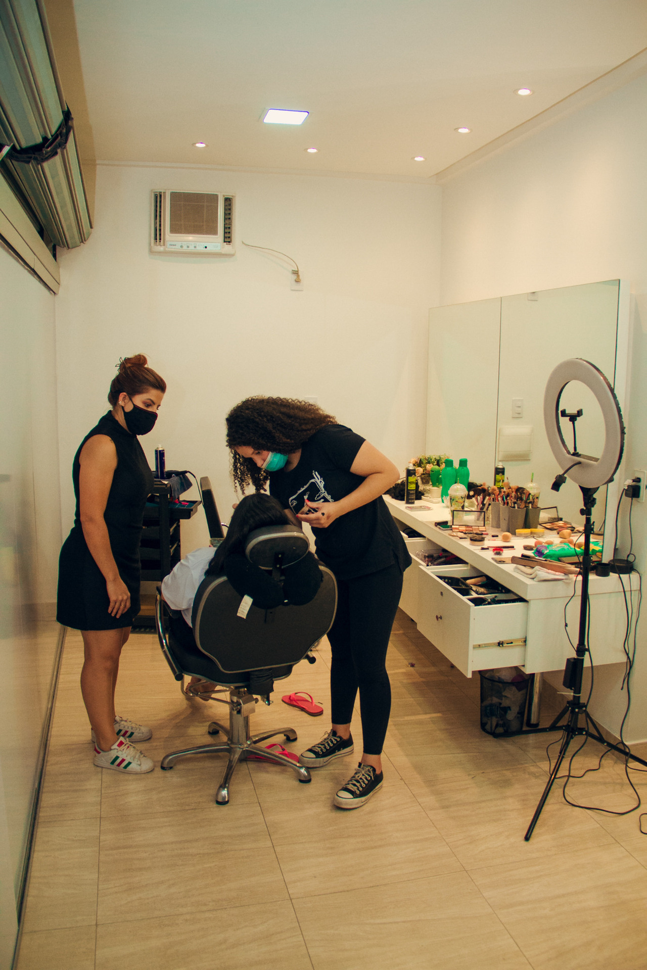 Assim que chegamos ao espaço, fomos recebidos com total carinho e profissionalismo, muita das vezes somos recebidos somente por oi ou até mesmo não somos recebidos nos espaços. Entramos e fazemos o nosso trabalho e pronto! Para as profissionais não faz nenhuma diferença! Mas lá o tratamento foi totalmente diferente. Em todo o momento perguntava se estávamos precisando de algo ou se estávamos com fome ou sede. Perguntava-nos o que queríamos fazer naquele momento, quais tipos de fotos iriam tirar. Algo raro! Algumas makes ( não são todas ) elas não se importa com o “fotografo”. Quer terminar o trabalho e pronto!